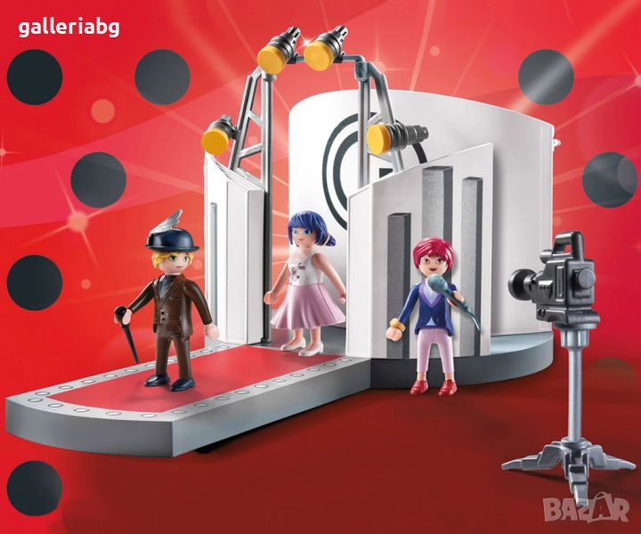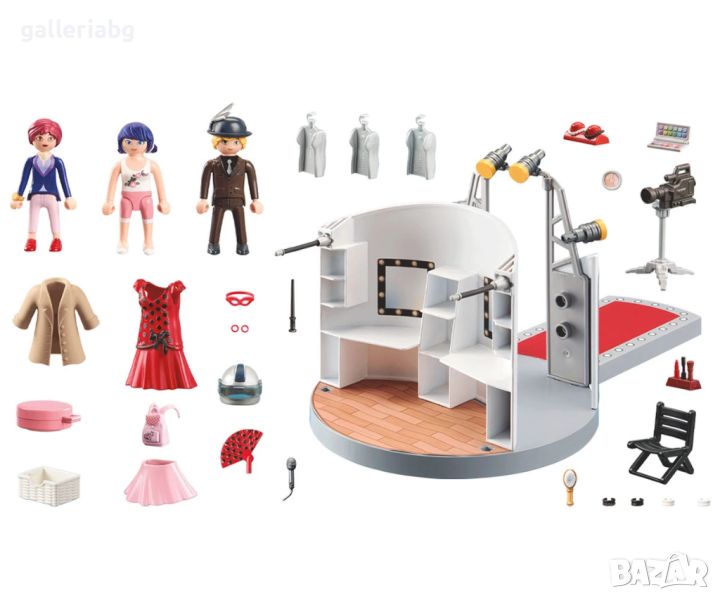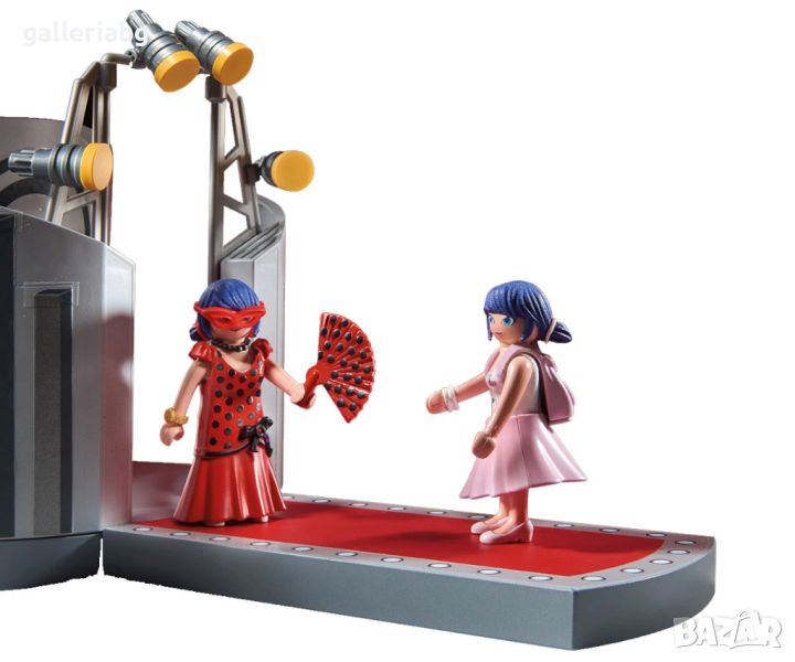 PLAYMOBIL Miraculous: Модно шоу в Париж! Комплектът включва главния герой и амбициозна модна дизайнерка Маринет Дюпейн -Ченг, както и Адриен Агресте, неин съученик и модел на модното ревю. Подиума се състои от кръгла основна плоча, подвижна пътека и стенни елементи с две съблекални. Тук героите могат да се подготвят за своите изпълнения и да съхраняват своите инструменти за грим и аксесоари на рафтовете на стената на съблекалнята. Маринет може да избира между елегантна рокля с подходяща маска и ветрила, модерна пола, раница, както и различни колиета и гривни. Адриен идва с палто, каска, бастун и стилна шапка. С този комплект децата могат да се потопят във вълнуващи ролеви игри и да развихрят своята креативност и въображение. Абсолютно задължително за всички фенове на Miraculous, за да пресъздадат любимите си сцени и да изживеят нови собствени приключения.