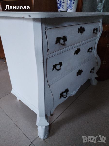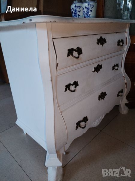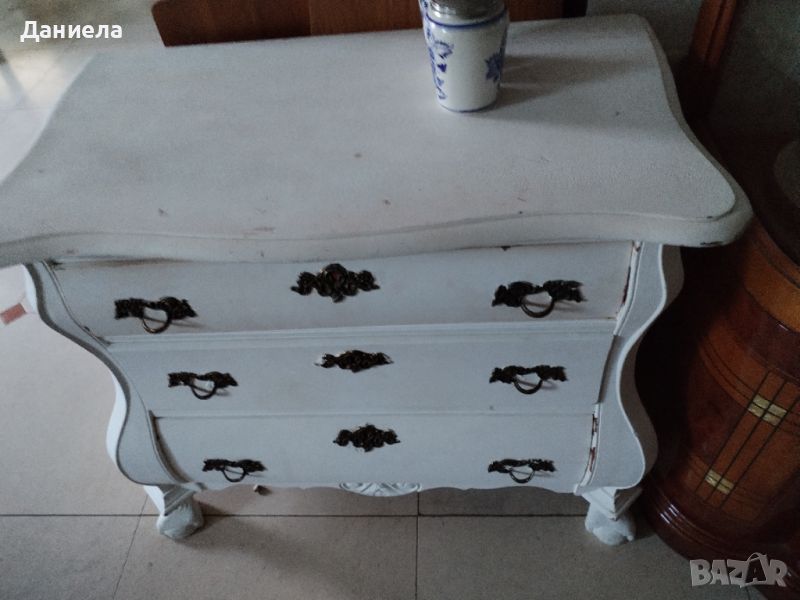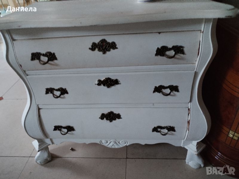 Старинен скрин от масив в бял цвят. Има три чекмеджета, дръжки от ковано желязо, дърворезба.