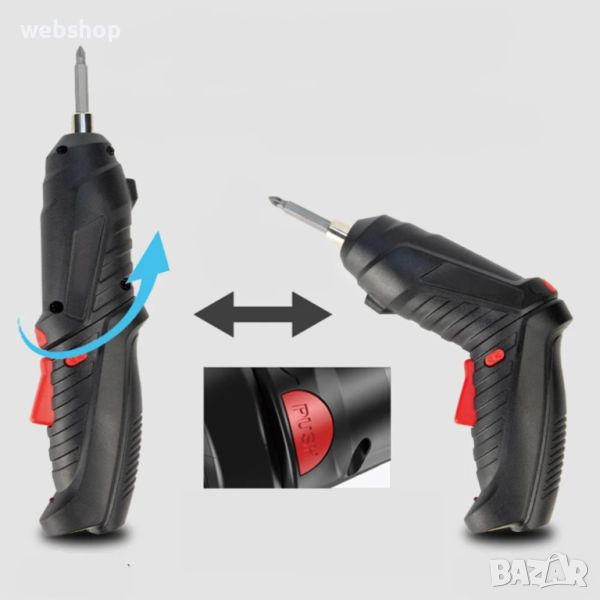 Електрическата отвертка има особеност - въртене на тялото с промяна на състоянието от право на 90°, т.е. позволява да държите инструмента като отвертка и като отвертка. За да промените формата на отвертката, трябва да задържите оранжевия бутон в горната част на тялото и да я завъртите на 180° по оста.