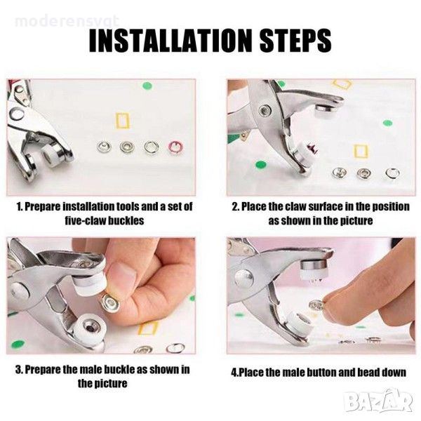 ръчна преса "клещи" за поставяне на тик-так копчета, е изработена от висококачествена ABS пластмаса. В комплект с нея е включен и органайзер със сто (100) капси от неръждаема стомана за поставяне.