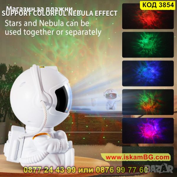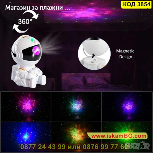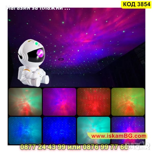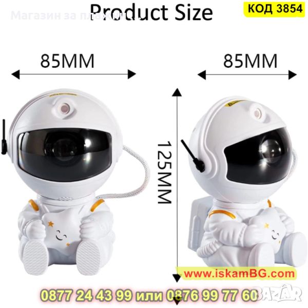 Астронавт тип прожектор звездно небе, който ще отведе детето ви в магията на космическото пространство. Тази нощна лампа визуализира изключително реалистично космическо пространство и звездни галактики. Проекцията се излъчва от скафандъра на космонавт. Представлява движещи се звездите и светлинните обекти, които сменят позицията си или напълно изчезват на фона на сменящо се цветно сияние. Сякаш наистина сте в космоса или наблюдавате през телескоп космически обекти. Детето ще ахне… Дори родителите ще харесат този звезден проектор.