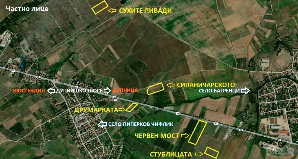 Продавам 8 броя земеделски имота в района на селата Пиперков чифлик, Багренци, Граница и Берсин, Област Кюстендил.