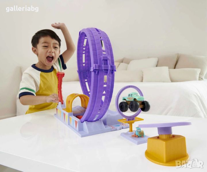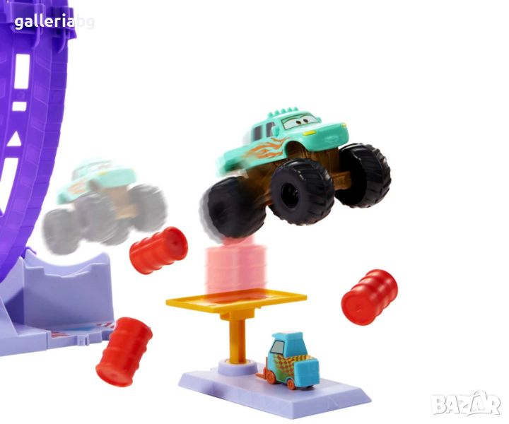 Вдъхновен от поредицата Disney+ от Pixar, Cars On The Road, този комплект за игра Showtime Loop включва любимия герой, Айви, в сцена направо от шоуто. Натиснете лоста напред и след това натиснете бутон, за да пуснете камиона Ivy около кръга, да пробиете варели и да прелетите над нейния приятел, Haul Em' Haynes Pitty, преди да кацнете върху подскачащата цел. Феновете на автомобилите ще харесат да създават любимите си моменти от поредицата с различни начини за поставяне на препятствия. Цветовете и декорациите могат да варират.