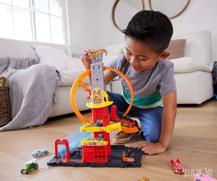 Hot Wheels™ City пожарна станция празнува любимото на децата място с многостепенна, регулируема примка, която задвижва колите през станцията и надолу по подобна на вода полупрозрачна рампа. Базата разполага с вълнуващи детайли за игра, които вдъхновяват креативното разказване на истории и конектори за свързване с други комплекти Hot Wheels. Всеки се продава отделно, според наличността. Включена е една пожарна кола Hot Wheels. Цветовете и декорациите могат да варират.