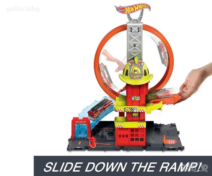 - Каскадирайте и се състезавайте през регулируем кръг, за да спасите Hot Wheels™ City с игралния комплект Super Loop Fire Station!