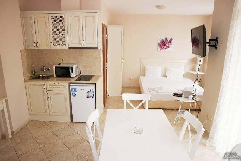 ЛУКСОЗЕН КОМПЛЕКС!!!Предлагаме за продажба стилен, напълно обзаведен апартамент в луксозен комплекс, разположен на 5 минути от една от най-големите атракции в курорт Слънчев бряг, Аквапарка. Комплексът се характеризира със спокойна локация в зелената и спокойна част, на разстояние от натоварените главни пътища, но близо до сърцето на курорта, на 10 минути от плажа. Апартаментът, който предлагаме се намира на трети етаж и се продава напълно обзаведен и оборудван. Състои се от всекидневна с кухненски бокс и кът за спане, спалня, две бани и хубава тераса. В апартамента има възможност едната спалня да се прегради и да станат три самостоятелни стаи. Комплексът се състои от две сгради и разполага с 150 апартамента с изглед към басейна, зелените площи и планините на Свети Влас. Тук ще откриете голям открит басейн, джакузи, сауна, парна баня, подводни легла за масаж, мокър бар, детски басейн, детска площадка, ресторант в средиземноморски стил (120 места) с просторна тераса с изглед към басейна, лоби бар, магазин, масаж, 24-часова рецепция, офис, паркинг, детски клуб и допълнителни услуги като рент-а-кар, трансфер до летището, такси, лекарска помощ, сейф, детско меню, колела под наем, безжичен интернет или всичко, което ви е необходимо за пълноценна почивка и релаксация.Апартаментите в к-са са с реална квадратура!