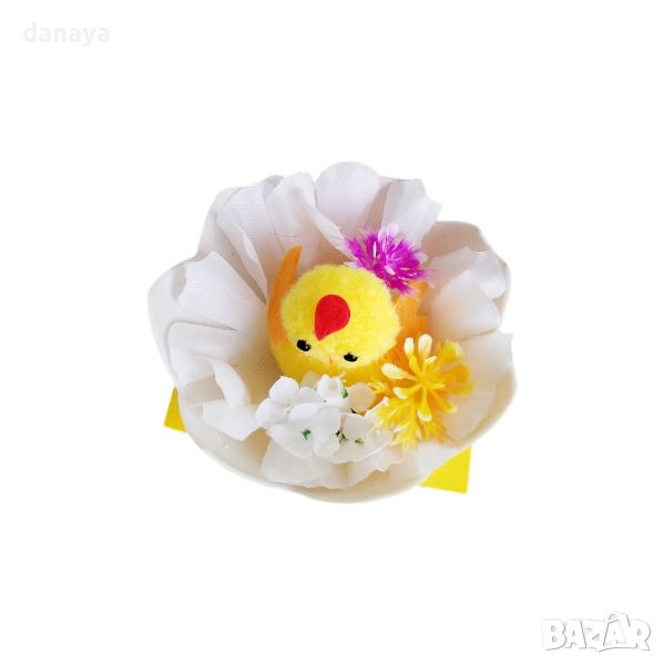 Малка великденска декорация жълто пиле с гнездо от черупка на яйце, декорирано с цветя. Подходяща за украса и декорация към великденските яйца и великденската трапеза. Пиленцата са изработени от плюшен материал, а гнездото от пластмаса.