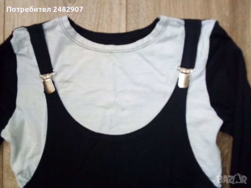 Дамска блуза в черно и сиво-бяло. Съдържа 95 % вискоза и 5 % еластан. Ширина в раменете - 33 см, ширина под мишниците - 36 см, ширина в долната част - 33 см, дължина от рамото до долу - 48 см, дължина на ръкава от рамото - 52 см, ширина на ръкава в долната част - 9 см. Запазена, с нормални следи от износване.