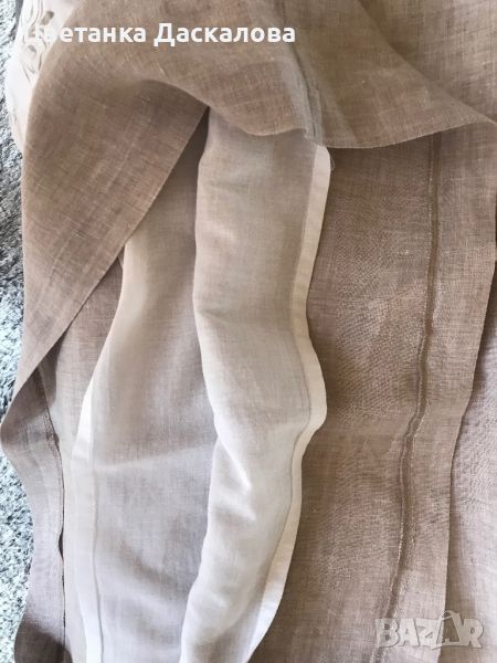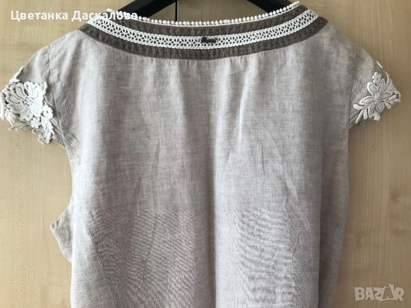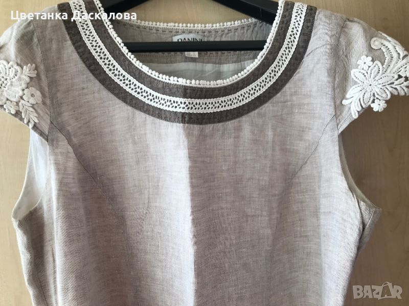 Дамска ленена рокля на модна къща Данини с бродерия и тензух Ена подплата-супер комфорт. Коланче-въже с кожа. Размери ГО-110 см., ханш 118 см., дължина 107 см. Обличана е само за повод.