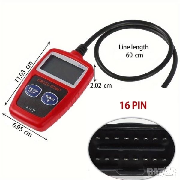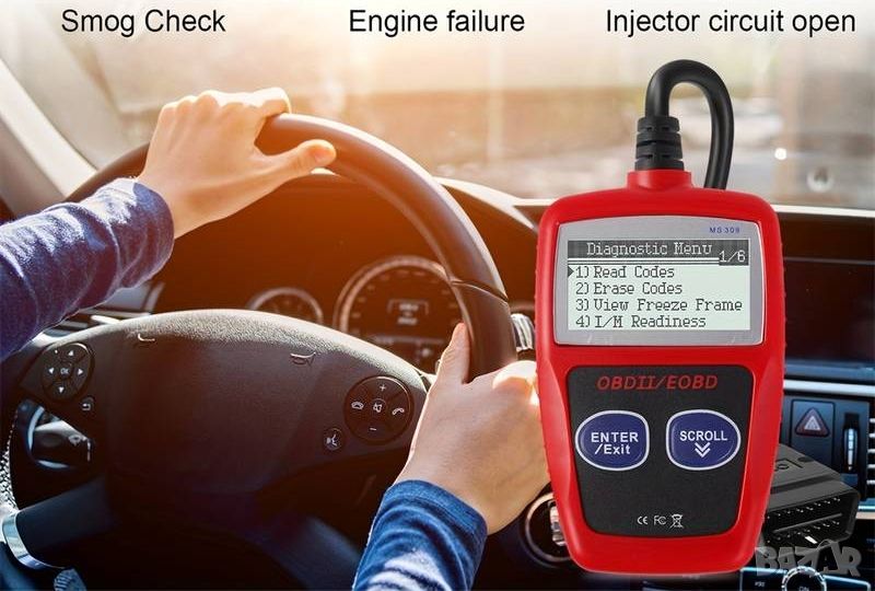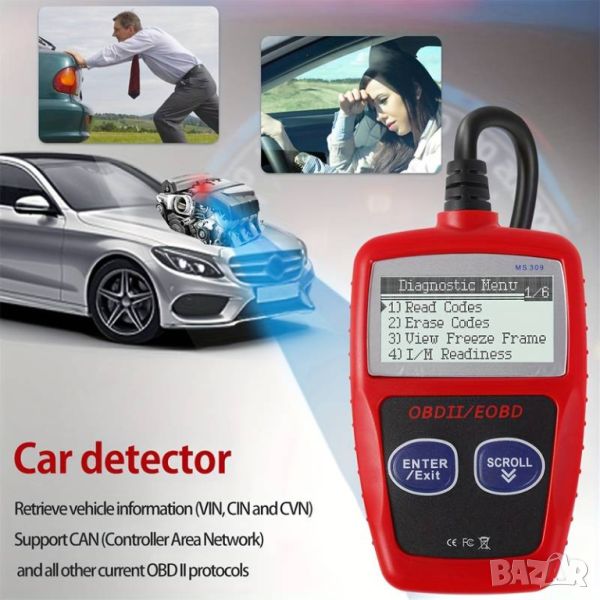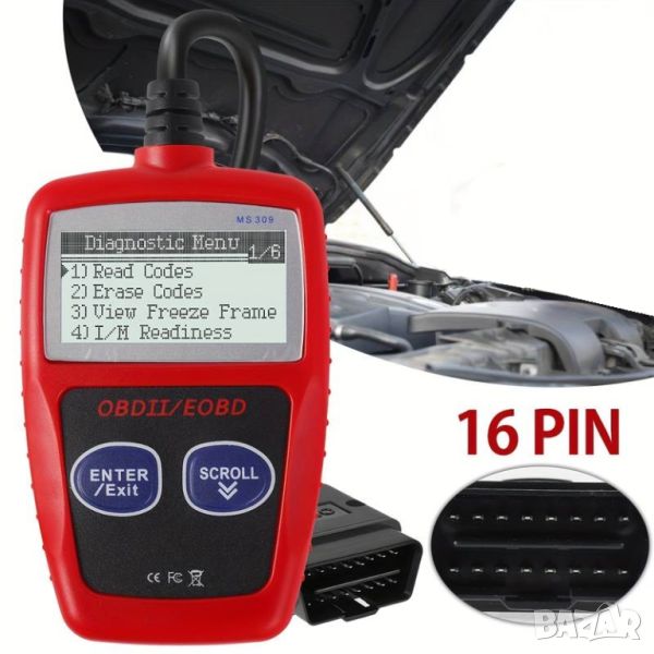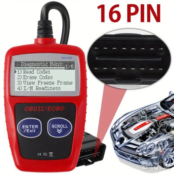 - Скенерът MS309 OBD2 се предлага с дизайн с два бутона и 2-редов LCD дисплей с подсветка, с интегриран 16-пинова OBDII букса, супер лесен за използване и четене.