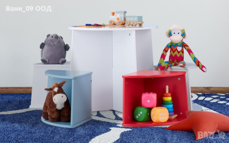 Компактните размери и възможността табуретките да се приберат плътно в масата, освобождават бързо пространство за други занимания. Освен това, всяко едно от 4-те цветни столчета е с отворено място за подреждане или съхранение на на любими играчки.