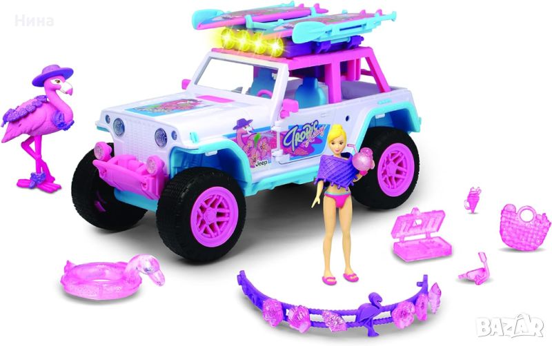 Слънце, плаж и море... 🏖️ Този готин Jeepster от Dickie разполага със свободно въртящи се колела и е идеален за използване на морския бряг 🌊 Пъргавият джип Pink Drivez Flamingo е идеален и за вашия пясъчник или градина, и гарантирано ще сбъдне мечтите на вашето малко момиченце ✨ Офроуд превозното средство се отличава с бял, розов и ярко син дизайн и може лесно да се маневрира по неравни терени. Светлинни и звукови ефекти и повече от 20 аксесоара, ще помагат за подобряване на когнитивните умения и фината моторика и въображението Включва: