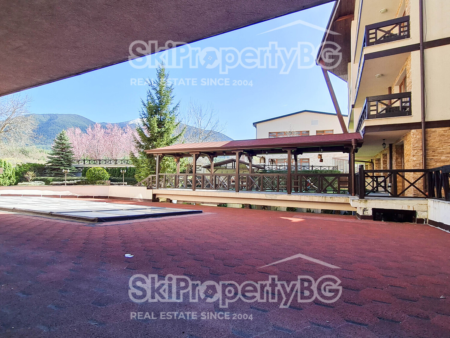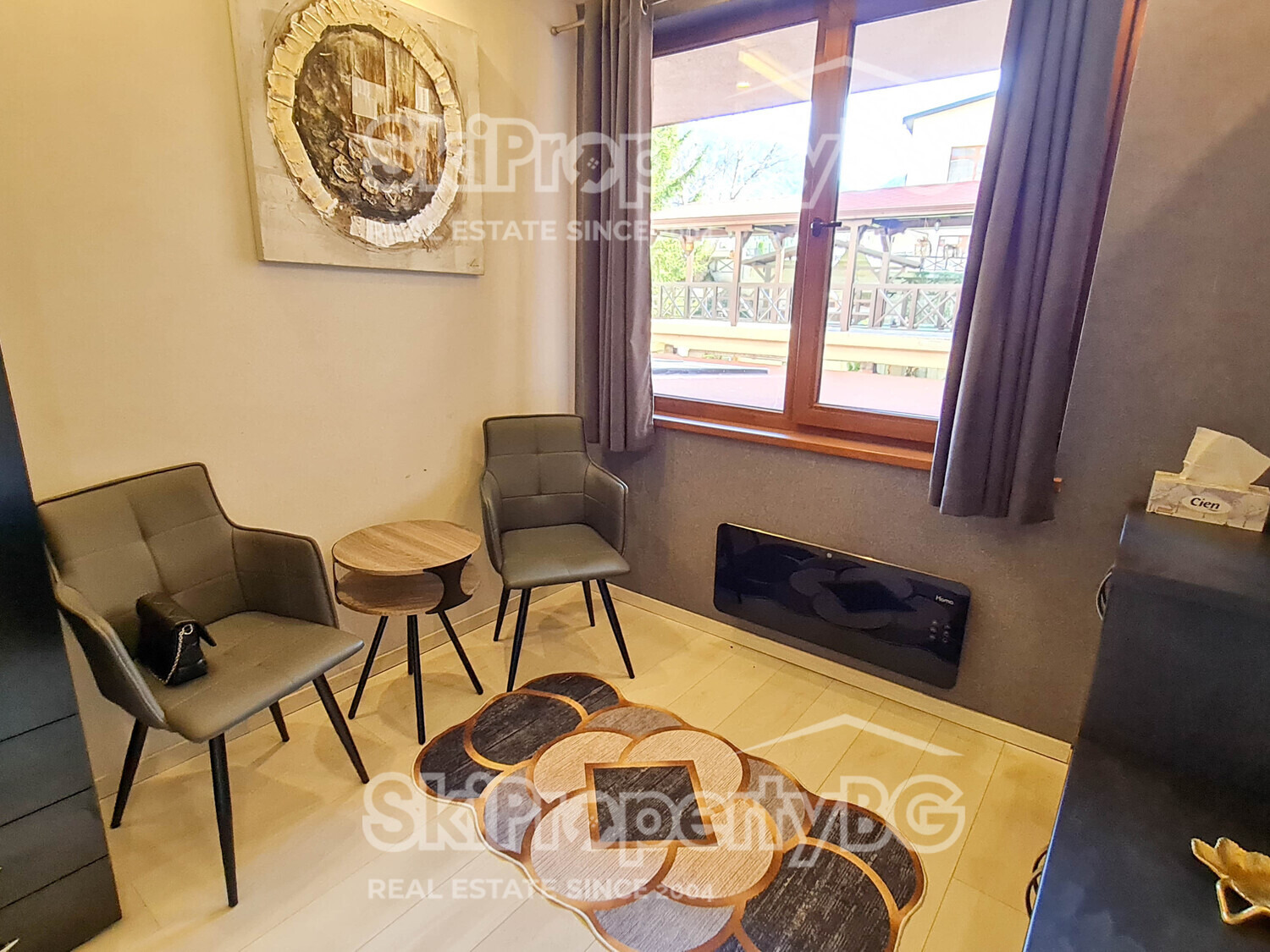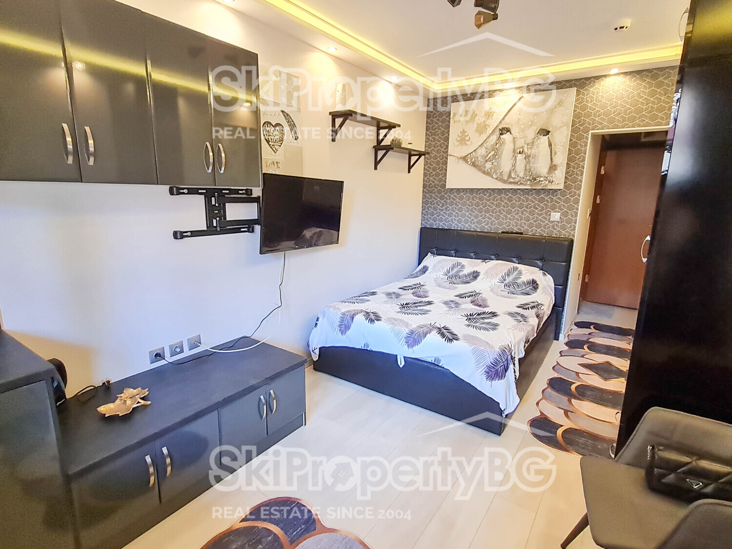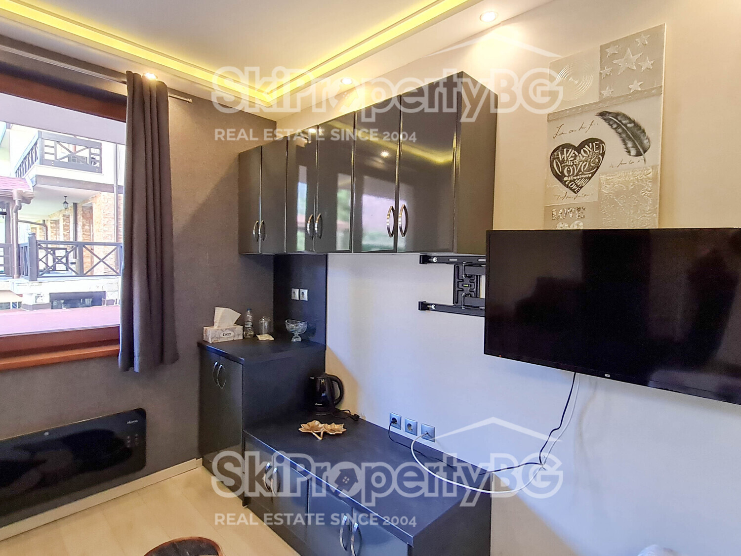 Жилището, което предлагаме за продажба е разположено на партерен етаж. То е тип хотелска стая и се състои от входно антре, спалня с гардероб, кът с маса и столове, баня с душ кабина. От прозореца се открива гледка към сградата на хотела и към планината. Общата му площ е 24,62 кв.м. (чиста площ 20,32 кв.м.).