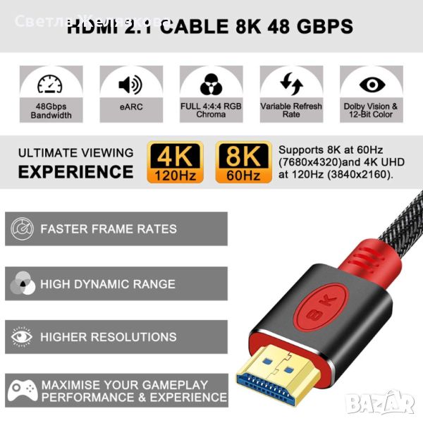 8K HDMI кабел 2.1: Насладете се на видео и цифрови аудио сигнали на най-високо качество. Този HDMI кабел съответства на най-новия стандарт 2.1, 4:4 хрома, който поддържа голямо разнообразие от високи резолюции и подкрепя видео с разделителна способност от 8K при 60 Hz и видео с разделителна способност от 4K при 120 Hz.
