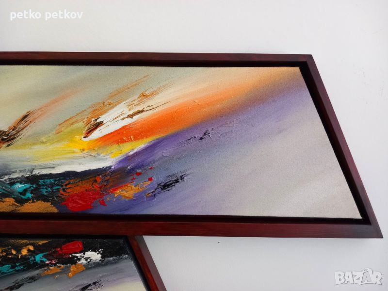 Картината е от две части в една "плаваща" рамка. Рисувана с акрилни бои върху платно на подрамки. Релефно изображение. Рамката е с махагонов цвят. Размери 100/48 см.