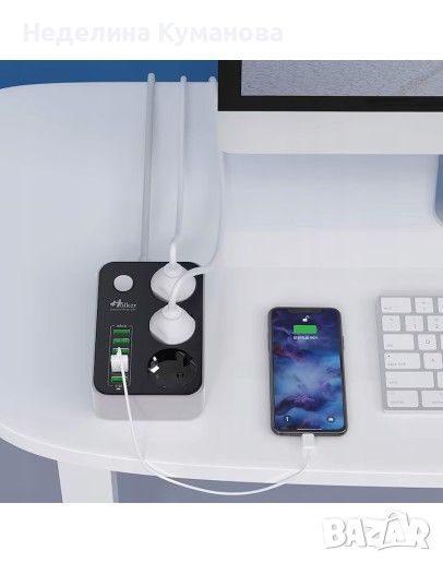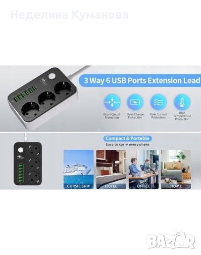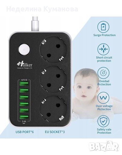 Разклонителят има 3 гнезда, 6 USB порта, копче за включване и изключване. Дължината на кабела е 1.6м. USB портовете са с технология за интелигентно зареждане - всеки USB порт разпознава автоматично включеното устройство ( GSM, Таблет, Power Bank и др.) и автоматично подава от 0.1 до 2.4А.