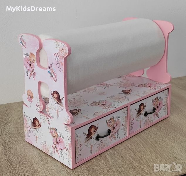 Ръчно изработен дървен органайзер за диадеми и аксесоари за коса с буква и две чекмеджета. Цветовете и темата могат да се променят, а основния цвят върху който се поставят диадемите може да е сив, бял или розов - Дължината е 33 см.