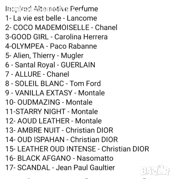 еднаква стойност на най-скъпите парфюми. Използвайки същите съставки, нашите аромати могат да продължат 12 часа минимална гаранция. Луксозните масла и правилните нотки, смесени с висока концентрация, обещават изключително качество и дълготрайно представяне.Без значение повод, този деликатен аромат ще отговаря на всеки повод и ще бъде оценен от получателя.Ние ви предлагаме най-високото качество на добра цена.