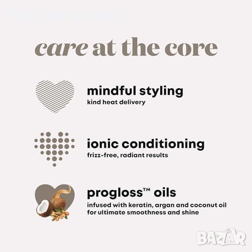 Progloss Масла: Обогатена с кератин, арганово масло и кокос, четката осигурява гладко и еднородно стилизиране.