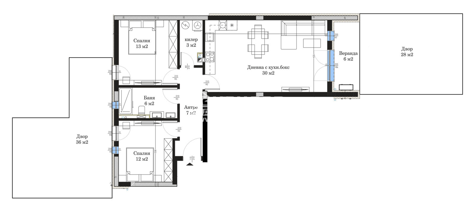 Оферта 64177: ЕКСКЛУЗИВНА НОВА СГРАДА, САМО ОТ КОНДОР ! Представяме ви нискоетажен модерен комплекс с големи и светли помещения с правилни форми, комфортни за обитаване и обзавеждане. Заложено е на индустриален стил в тих и спокоен район заобиколен от зеленина. Жилището, което ви предлагаме се състои от ПРОСТОРНА дневна с кухненски бокс и трапезария 30 кв.м С ФРЕНСКИ ПРОЗОРЦИ, две спални, коридор, голяма баня с тоалетна- 6 кв.м, широко перално помещение- 3 кв.м., тераса към дневната, ОЗЕЛЕНЕН ДВОР към дневната- 28 кв.м и втори ДВОР към спалните- 36 кв.м. Комплексът е от затворен тип с бариери, но БЕЗ ТАКСИ за поддръжка, с видеонаблюдение. Високо качество на изпълнение на обекта: външна топлоизолация 12см, шумоизолация на външните стени, шумо и топлоизолация на междуетажните плочи, многокамерна ПВЦ дограма с двоен стъклопакет, асансьор с топла връзка до подземието, станции за електромобили, кабелни трасета- SMART House и 2200 кв.м ОЗЕЛЕНЕН ДВОР! Избор на надземни и подземни гаражи и паркоместа! Гъвкъви схеми на плащане спрямо клиента, съдействие от банки партньори на агенцията за кредит!