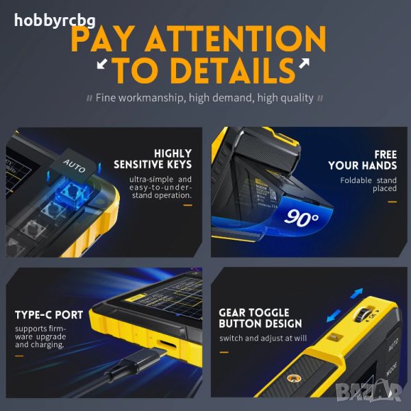 Може да се използва както за периодични аналогови сигнали, така и за непериодични цифрови сигнали, като може да измерва и напрежения до ±400 V. Оборудван с ефективен автоматичен бутон, той може да показва измерената форма на вълната без тромави настройки. Оборудван е с 2.8-инчов LCD екран с висока разделителна способност с резолюция 320x240 пиксела и вградена 1000 mAh литиева батерия за до 4 часа работа.