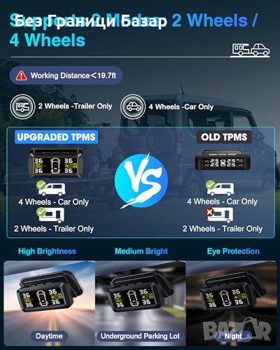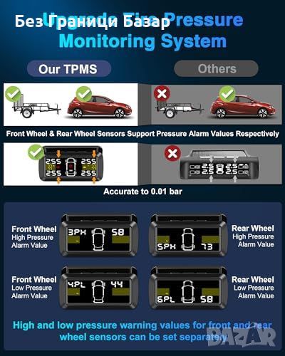 Универсална Система за Мониторинг на Налягането в Гумите: Подходяща за 2 или 4 колела. Точност до 0.01bar, с индивидуални настройки за аларма за високо/ниско налягане на предните и задните гуми.