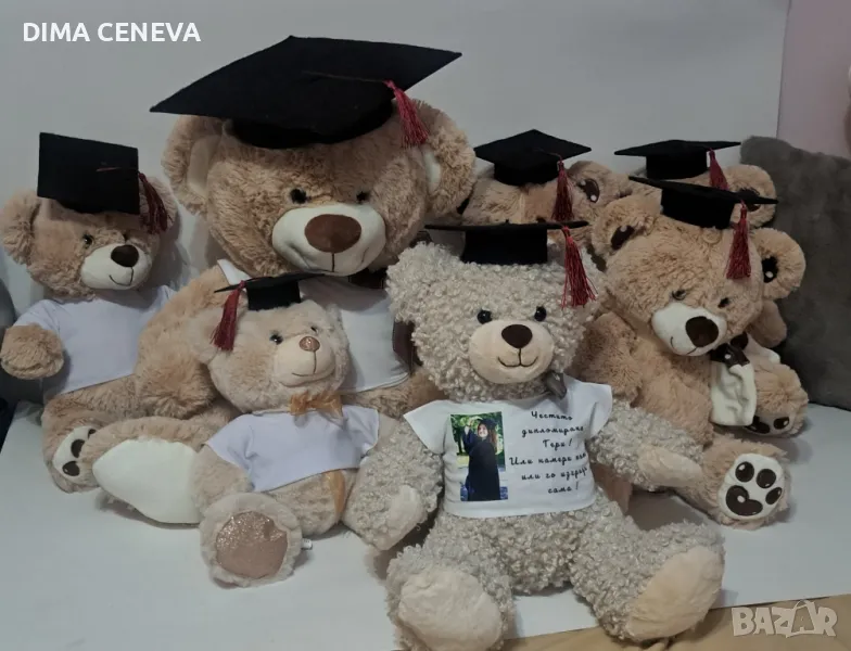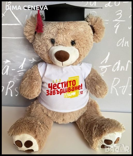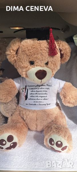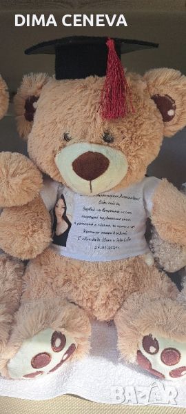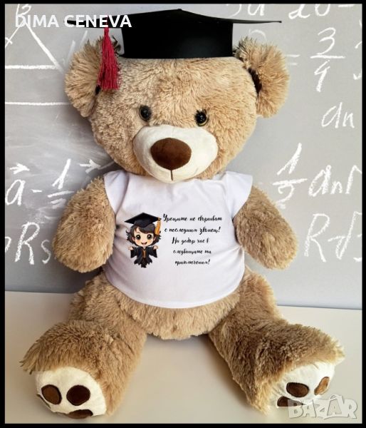 Личен подарък за всеки повод . Плюшени играчки с тениска и персонаизиран ваш текст по избор, за спомен за абсолвент с шапка или за рожден ден, кръщене и друг празник без шапка.