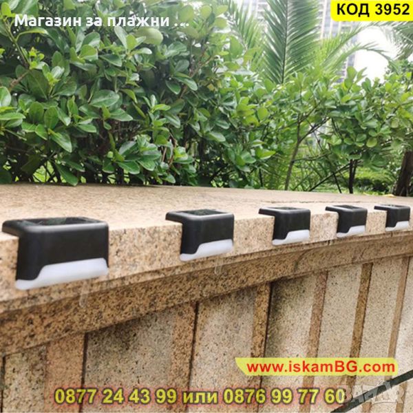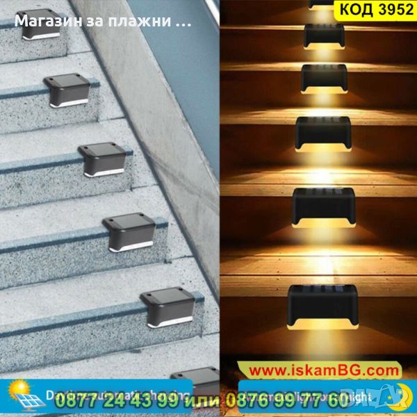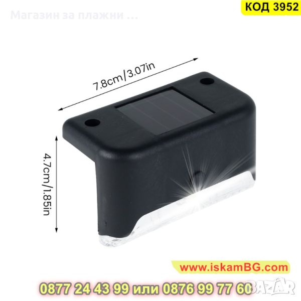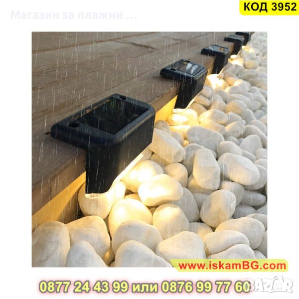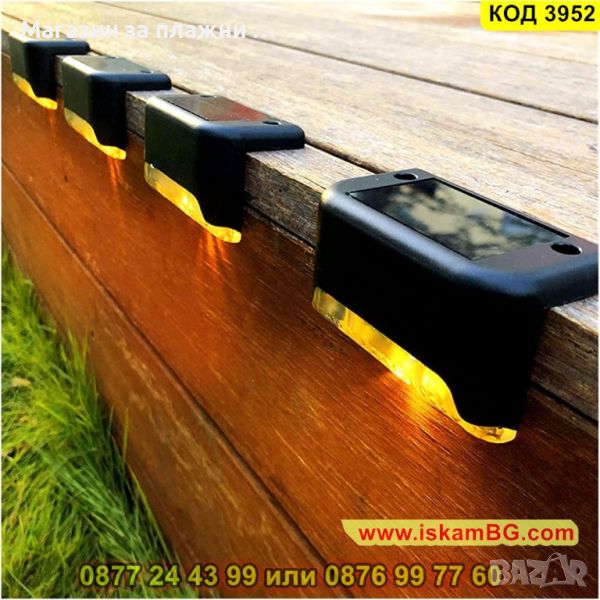 Соларни лампи, които Ви представяме са подходящи за осветление на тераси, стъпала, парапети и други. Те светят в топла жълта светлина. Водоустойчиви и лесни за монтаж - с помощта на двойнозалепваща лента и два винта. Благодарение на соларният панел, който всяка лампичка има, няма да е необходимо да прекарвате електрическа инсталация навън. Зареждането на соларните лампи се извършва през деня, от слънчевата енергия, а вечерта се включват автоматично. Когато се зазори те се изключват. Материалът, от който е направена лампата е издръжлив екологичен ABS. Сертифицирана по IP65, водоустойчива и подходяща за употреба на открито, без значение от метеорологичните условия.