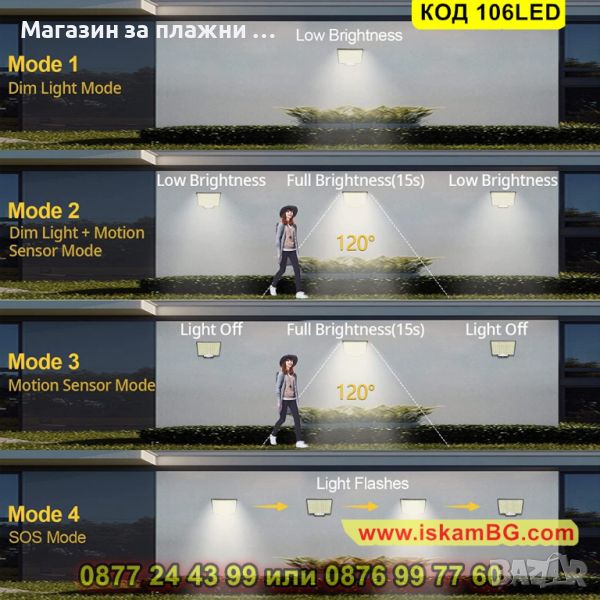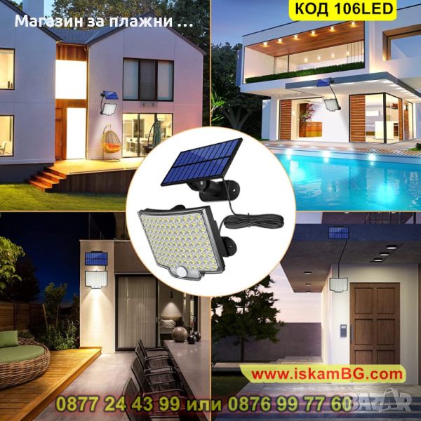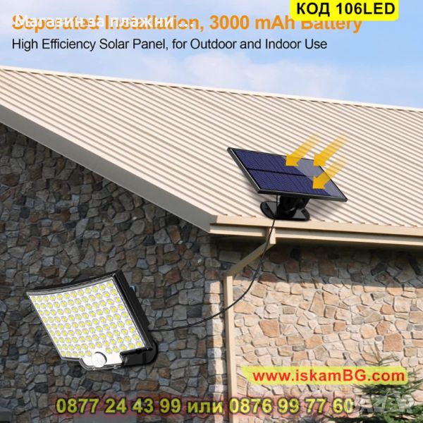 Външна лед соларна лампа, която има 106 диода и свети в ярка светлина подходяща за открити терени. Тази лампа съчетава в себе си висококачествена LED технология със соларна енергия и сензор за движение, като предлага екологичност и практичност. Ниската консумация на енергия прави лампата енергоспестяваща, има дълъг живот. Със своите 106 LED диода, тази соларна лампа ще Ви подари качествено осветяване. Също така, лампата се активира автоматично при засичане на движение в близост от 3-5 метра и така песи енергия. Соларният панел на лед лампата е изнесен и независимост от електрическата мрежа. Панелът събира слънчевата енергия през деня и зарежда вградената батерия, а през нощта лампата се поддържа в работно състояние благодарение на заредената батерия. Подарете си удобство, стил и спестете средства за електричество чрез тази енергоспестяваща и ефективна лед външна лампа, която има 106 LED диода. Подходяща е да се използва за осветяване на градини, входове и всякакви места за опазване на реда и околната среда. Издържа на сняг, вятър и дъжд. Инсталира се лесно и бързо.