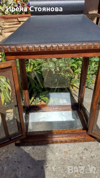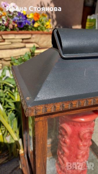 Винтидж поставка за свещ. Дървена къщичка с метален покрив с отвор и стъклени стени и дръжка за пренасяне. Цвят палисандър. Като цяло в много добро състояние. Леки забележки по капака на места. Размери височина 39 см, ширина 27 см и дълбочина 18,5 см. Цена 80 лв., заедно със свещ 95 лв.(Малка забележка на свещ)