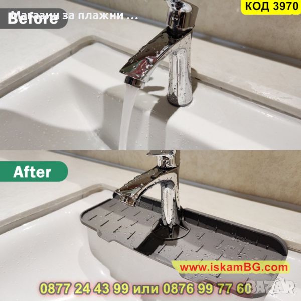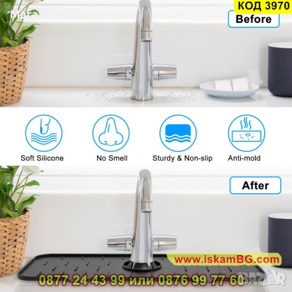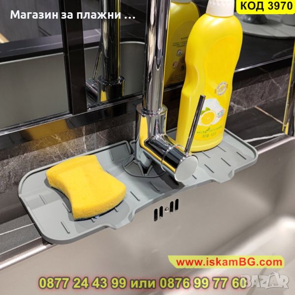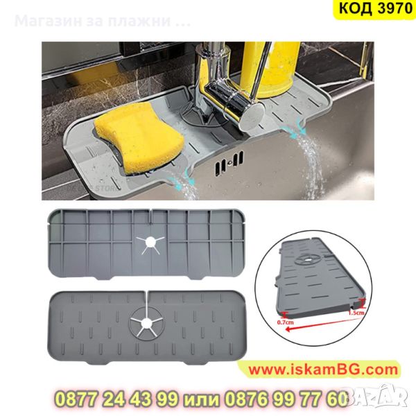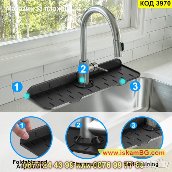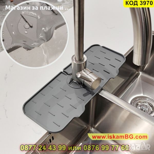 Силиконовата подложка е предназначена за кран на мивка с улеи за оттичане на водата директно в мивката. Плъзгайки силиконовата подложка около кухненския Ви кран ще можете да уловите капките, поддържайте плота на мивката сух. Силиконовият уловител на кран се използва и като водоустойчив органайзер за съхранение на гъби и сапуни. Повдигнатите ръбове, които подложката за отцеждане има насочват водата към два дренажни отвора в мивката, поддържайки зоната около крана суха и чиста. Така предотвратяват пръскането на вода върху плота, когато миете ръцете си, изплаквате съдовете или почиствате продуктите, запазвайки го сух.