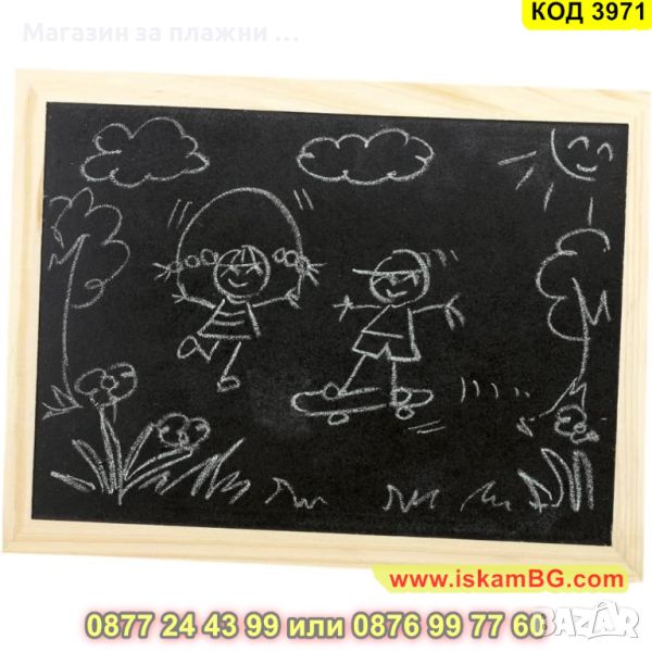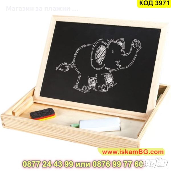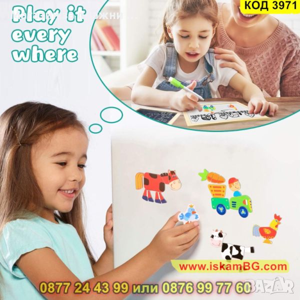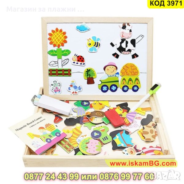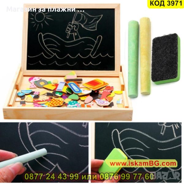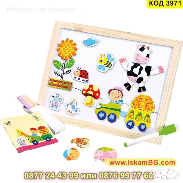 Бялата магнитна страна служи за да се подредят магнити и за писане с маркер за сухо изтриване. Тъмната страна представлява традиционна черна дъска, която позволява да се пише с тебешир. Комплект от цветни магнитни пъзели, от които можете да създавате разнообразни, красиви и интересни картини на дървената магнитна дъска.