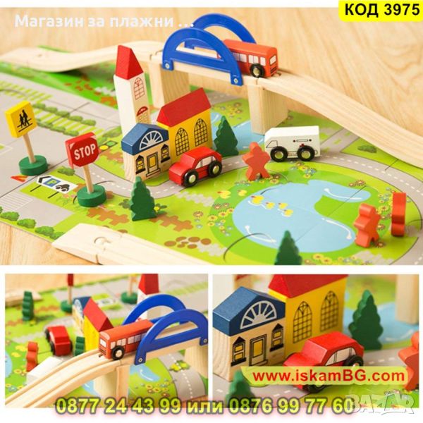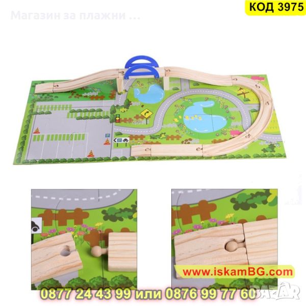 Дървената играчка - комплект с колички с писта за игра, която се състои от 40 елемента ще събуди интереса на всяко хлапе. Тази игра е подходяща за деца над 3 годишна възраст. Пистата за игра е изключително здрава и издръжлива. Материалът, от който тя е направена е висококачествено дърво и полирана до съвършена гладкост. Комплектът за игра съдържа 40 части, като 10 от тях са специално проектирани за сглобяване на възхитяващ мост. Също така, към този комплект са включени още 4 коли, пътни знаци и подложка за пъзел, пъзел от 8 части, изобразяващ улица и пътища, които малчуганът може лесно да сглоби. Елементите на пистата се закрепват един към друг с помощта на канали, оформени като топки, гарантиращи стабилност и безопасност по време на игра. Включени са и още дървета, фигури на хора и кубчета за изграждане на сгради.