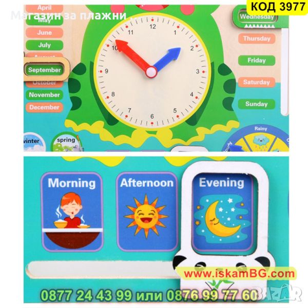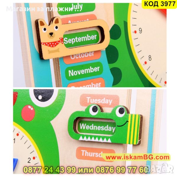 Това е перфектната играчка, която съчетава забавление с обучение – включва детайли ден-нощ и времеви аспекти. Дървеният панел е обогатен с интуитивен часовник, цифри от 1 до 31, които представят дните от месеца, 12 месеца от годината, сезоните, както и ключовите моменти от деня: сутрин, обяд, вечер. Допълнително, дни от седмицата – от понеделник до неделя и различни времеви условия – от дъждливи до слънчеви дни.