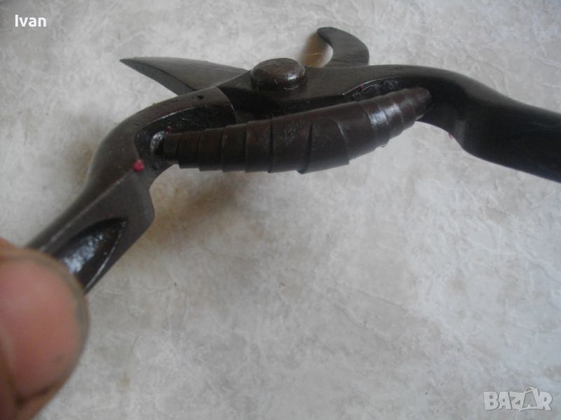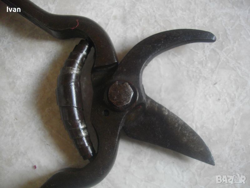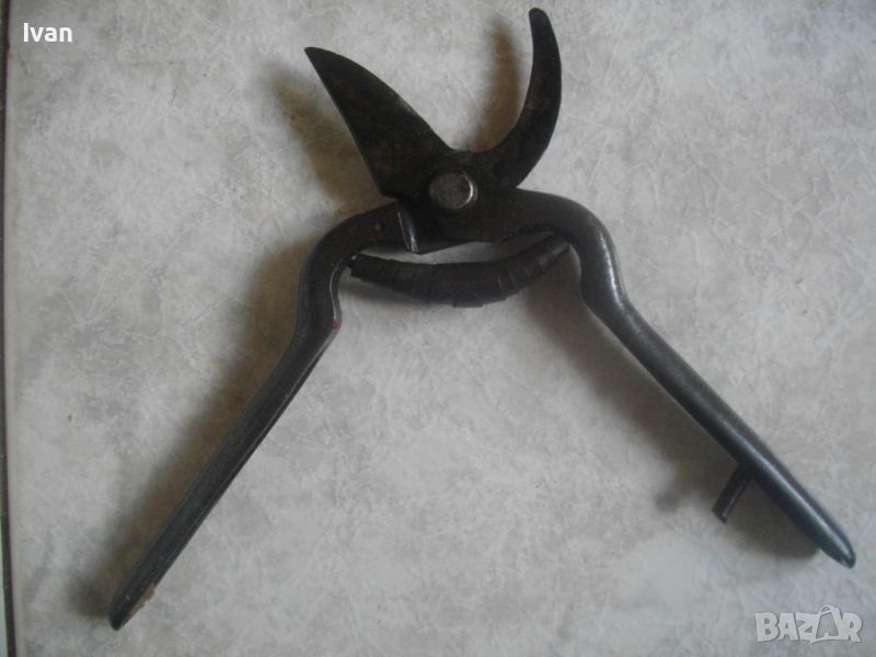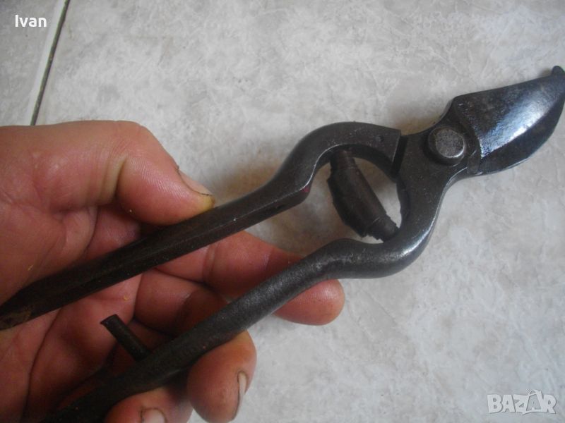 ОПИСАНИЕ НА българска овощарска/лозарска ножица. Ретро/винтидж инструмент от времето на Соца в НРБ. запазен външен вид и ОТЛИЧНО техн. и работно състояние. Ръчно кована. С патина. Цялостна дължина - 220 мм. Дължина остриета - 50 мм. Прижина възвратна - 70 мм.