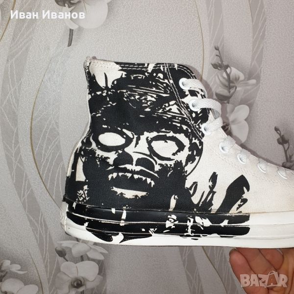 CONVERSE Chuck Taylor All Star ZombieПривличащи вниманието обувки ConverseAll Star хай-топовеПринт на Зомбибъдете по-бързи от бърз куршум и вземете своя чифт днес!Кецове Converse (конверси) Chuck Taylor All Star модел 122148 - бяло-синьо-червени високи маратонки Converse с щампа на Зомби. Този модел е за тези, които обичат класическия конверс, но още повече обичат оригиналността. Е, също и за тези, които обичат ужаси , особено със ЗомбитаНаистина страхотни забавни баскетболни високи кецове от Converse.Converse All Star 122148 е меко казано поразителен със своите привличащи вниманието горни части, украсени с техния DC Comic отпечатък върху платно на Супермен и американския орел, разположени на фона на звезди и райета. Линията на отворите на мъжката баскетболна обувка 122148 е оградена от двете страни с двоен ред бели шевове, които продължават до горната линия на обувката. Тези високи баскетболни обувки Converse се закопчават с плоски бели връзки, които се кръстосват отпред през осем чифта метални капси в сребрист цвят върху мек бордо език със Супермен в горната част и бели звезди на гърба. Ако искате да промените дантела, 122148 се предлага и с тъмносини и бордо връзки - или можете да се побъркате и да завържете и трите. Широка бордо ивица се простира нагоре по гърба на ботуша DC Comic All Star 122148 от петата до горната линия, и марката Converse All Star може да се намери от вътрешната страна на глезена. Позволявайки на краката ви да дишат, All Star 122148 има две капси точно над стъпалото.Вътрешната част на 122148 е подплатена с платно в бордо, покрито с платно с бели звезди. По протежение на обиколката на бялата междинна подметка на баскетболните обувки има тесен ред кантове в бордо и тъмносин един по-долу. Бяла гума, обгръщаща върха на глезена на обувката и текстурирана подметка, допълват баскетболната обувка All Star