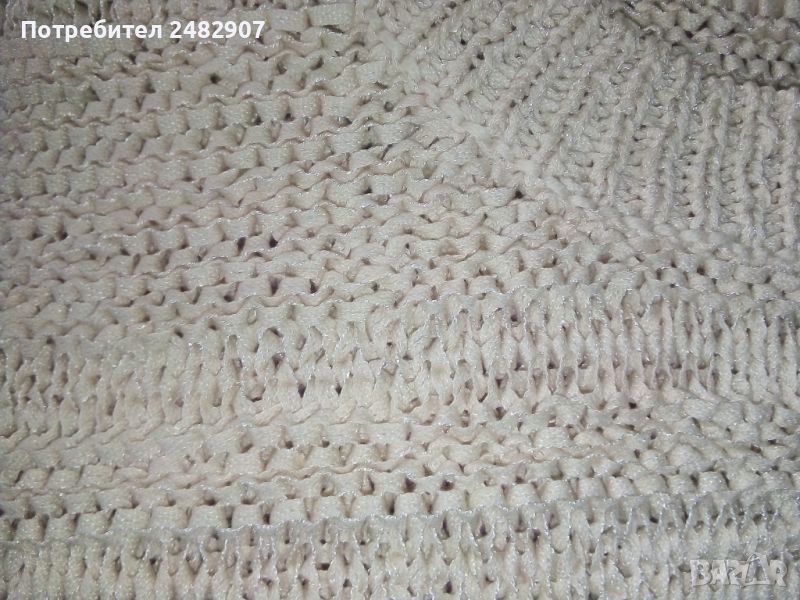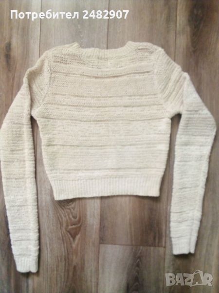 Къса машинно плетена дамска блуза, цвят екрю. Ширина в раменете - 34 см, ширина под мишниците - 42 см, ширина в долната част - 32 см, дължина от рамото до долу - 44 см, дължина на ръкава от рамото - 71 см, ширина на ръкава в долната част - 8 см. Много запазена, почти не е използвана, отлично състояние, без забележки.