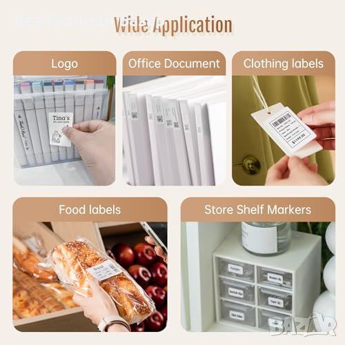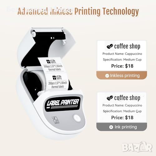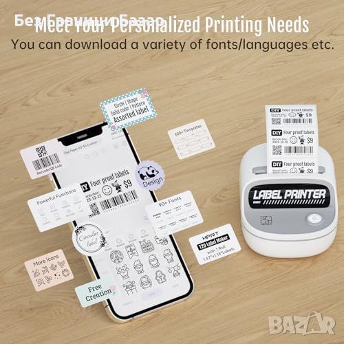 Универсален принтер за етикети: HPRT T20 позволява печат на етикети с широчина от 0.8 до 2 инча, поддържа текст, изображения, QR кодове и баркодове.