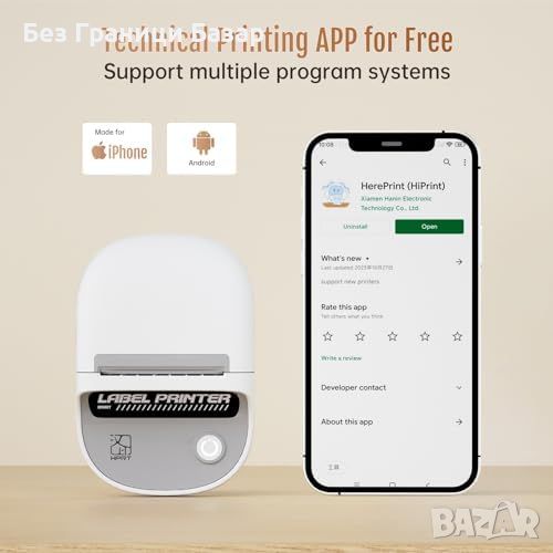Безплатно приложение за печат: Съвместимост с iOS и Android, лесно свързване чрез Bluetooth и разнообразие от шрифтове, граници и символи.