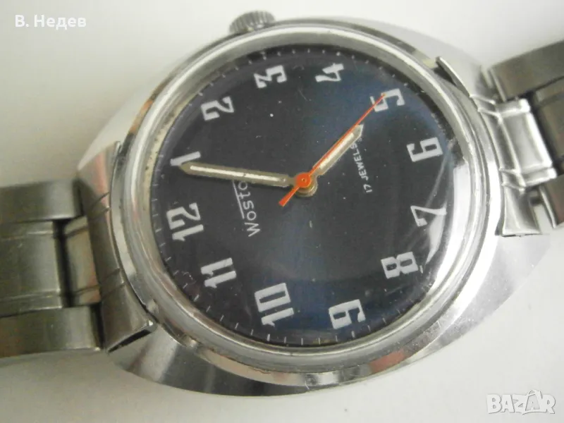 Продаваме този супер запазен руски /съветски/ часовник - почти като нов! Ръчно навиване, отлично състояние - циферблат, цифри, стрелки, машина - супер състояние; моля разгледайте подробно снимките! WOSTOK, 17 jewels, madе in USSR - изключителен часовник! Нормален мъжки размер на корпуса - диаметър 35,5 мм, без коронката. Здрав и надежден часовник с командирската машина. Външния вид на часовника се вижда на снимките, така, че ще опиша по-подробно машината - Кал. 2409 А, ръчно навиване, т. нар. "командирска" със 17 рубинови камъка, противоударен баланс /амортисьор на оста/; много безотказна и мн. надеждна; вибрации на баланса 19800/час; запас на хода - около 44-45 часа. Стандартната честота на вибрациите на баланса при винтидж часовниците е 18000/ч. Колкото