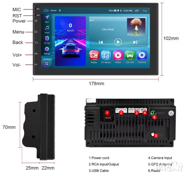 6. Вход за задна камера, когато автомобилът превключва назад и показва изображението на екрана на устройството. Задната камера се продава отделно.