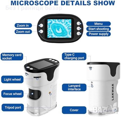 Портативен цифров микроскоп LAKWAR с мощност от 200 до 1000 пъти увеличение.
