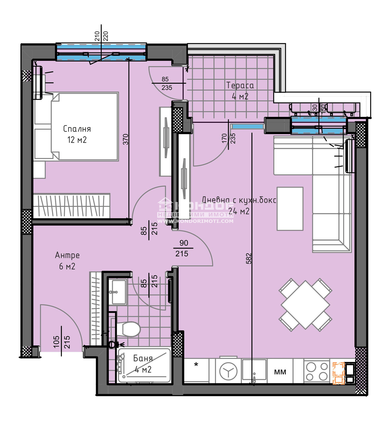 Оферта 64169: Предлагаме Ви възможността да закупите 2-стаен апартамент в новоизграждащ се луксозен жилищен комплекс с модерна визия, проектиран да създаде максимален комфорт на живущите в него. Tри хоризонтално разположени жилищни секции с елегантен силует готов да предложи комфорт и модерен начин на живот. Едно от основните му предимства е добрата локация, отлична комуникативност и динамична пътна инфраструктура, която осигурява бърз и лесен достъп до комплекса, от всяка точка на града. Той съчетава лукс, спокойствие и комфорт, с подсигурени паркоместа и гаражи. Жилището се състои от дневна / 24 кв.м./ с кухненска част и трапезария и излаз на обща тераса, една самостоятелна спалня, баня с тоалетна и широко входно антре с място за гардероб. Към апартамента има прилежащо складово помещение включено в цената. Основната концепция при проектирането е да се постигнат просторни и функционални стаи, с цел да се създаде максимален уют на модерното семейство. Изключителна съвременна архитектура и модерна технология на строителство. Визията е иновативна, привличаща внимание с уникалността си. Всяко жилище ще разполага с пълно окабеляване за домофон, интернет и кабелна телевизия, общите части са луксозно завършени, жилищата са с алуминиева дограма с троен стъклопакет от най-висок клас, масивна блиндирана входна врата. За удобство на живущите съществува възможността да закупят подземни паркоместа и гаражи с топла връзка към комплекса. Гъвкави схеми на разсрочено плащане спрямо възможностите на клиента в рамките на строителството или закупуване чрез Банков Кредит, на изключително изгодни условия за клиенти на агенцията !!! Приложените изображения са от завършени проекти на строителната фирма.