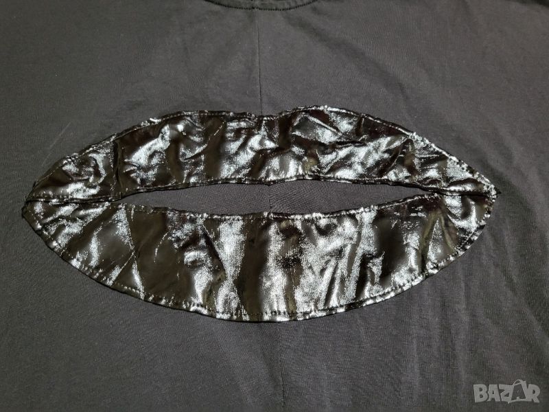 Черна туника от еластично трико и апликация от лачена кожа. Размера е универсален, а модела е много широк и свободен.