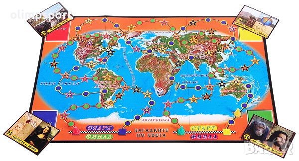 Играта съдържа: игрално поле, 30 карти със снимки и данни, 1 зар, 4 пионки, упътване за играта.