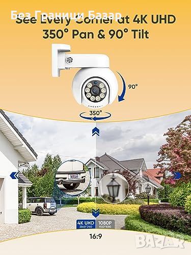4K Резолюция: 8MP камера с панорамиране до 350° и наклон до 90° за цялостно покритие.