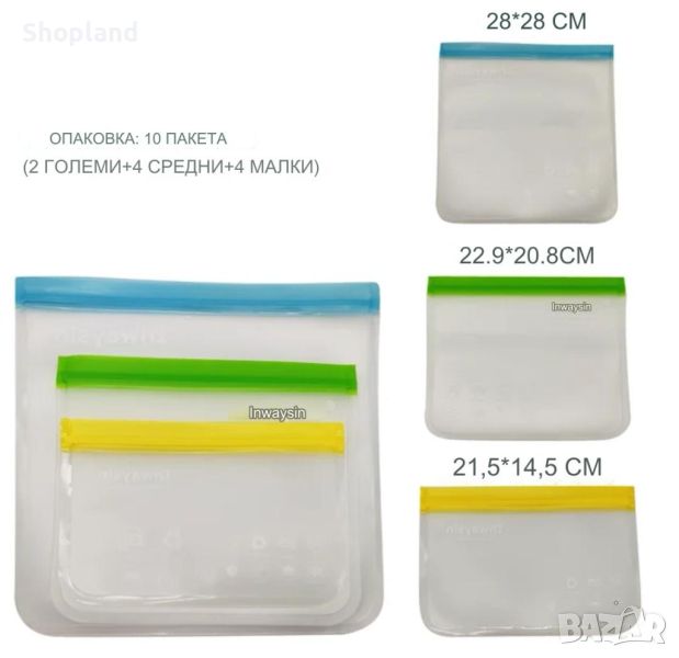 Те са устойчиви на протичане и въздухонепроницаеми, което прави удобни за съхранение на различни храни и за опазване на свежестта и вкуса им. Комплектът от 10 броя пликове е много практичен за употреба вкъщи, на работа или на път и може да се използва многократно.