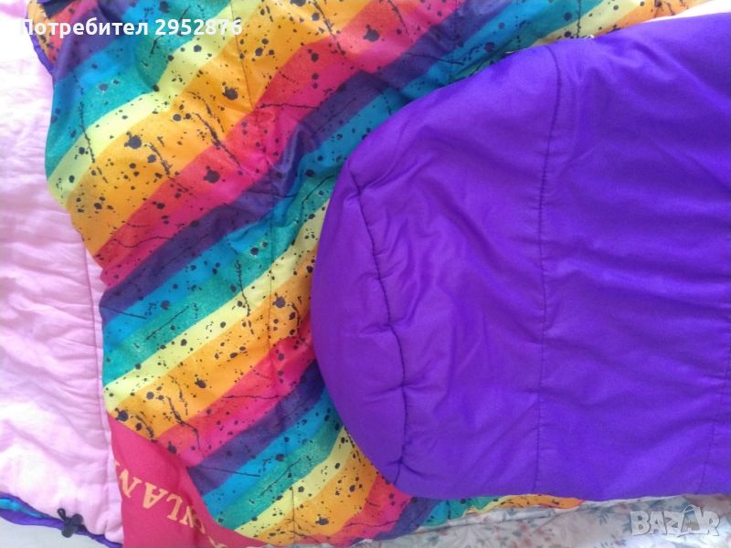 Лицето е шарено, а гърбът лилав цвят, работещ цип с двустранно отваряне и затваряне, може да се ползва навсякъде и топли много,дължина 220 см. вижте и останалите ми обяви 700