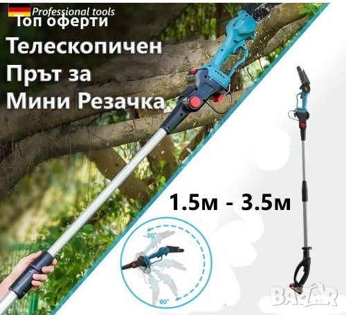 Телескопичен прът за акумулаторен трион за клони e с голям диапазон приложение в овощарство и градинарство. Дължината на пръта е с диапазон 1.5- 3.5 метрс с е напълно универсален. Подходяща е за поддръжка на всякакви видове овощни дървета, за окастряне на клони на трудни за достигане места. В долната част на дръжката има превключвател за захранване.