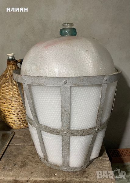 Стъклена дебелостенна дамаджана с метална кошница и допълнителна изолация против счупване 60 литра. Чиста-Ползвана само за отлежаване на концентрат Лично предаване.